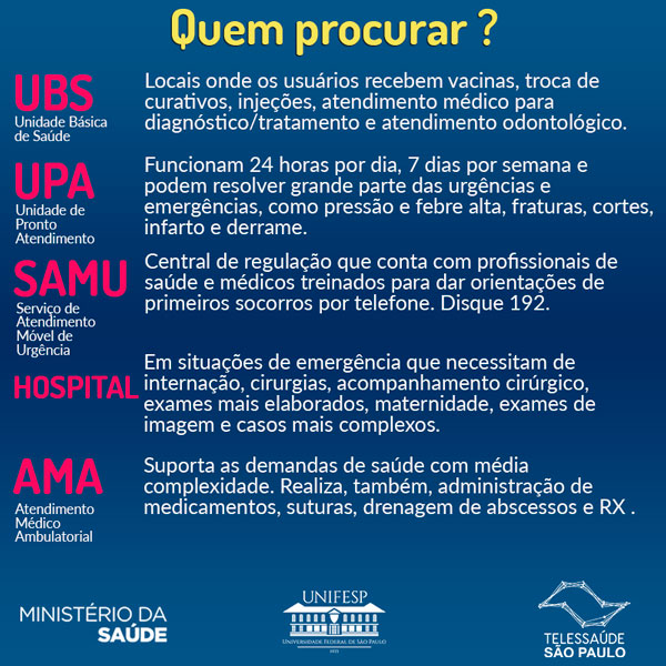 O SUS tem uma área de abrangência muito ampla para as diferentes necessidades da população. Citando as mais populares, existem as UPAs (Unidade de Pronto Atendimento) que realizam atendimento de urgência e as UBS (Unidade Básica de Saúde), os famosos ‘postinhos’, voltados para a atenção primária à saúde. Uma Unidade Básica tem, ainda, a possibilidade de adotar a Estratégia de Saúde da Família, como uma USF (Unidade de Saúde da Família), a diferença está na promoção de ações para a prevenção de doenças com grupos de moradores de cada território.