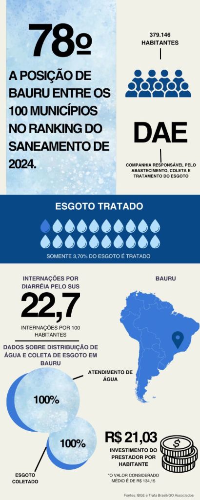 Em Bauru, desde 1962, a entidade responsável por gerir, administrar e desenvolver os serviços públicos de água e esgoto na cidade é o DAE, Departamento de Água e Esgoto de Bauru. O DAE é uma autarquia, então ele possui autonomia em sua administração interna apesar de ser fiscalizada por órgãos públicos. No infográfico abaixo, é possível analisar o cenário do saneamento básico de Bauru em 2021.