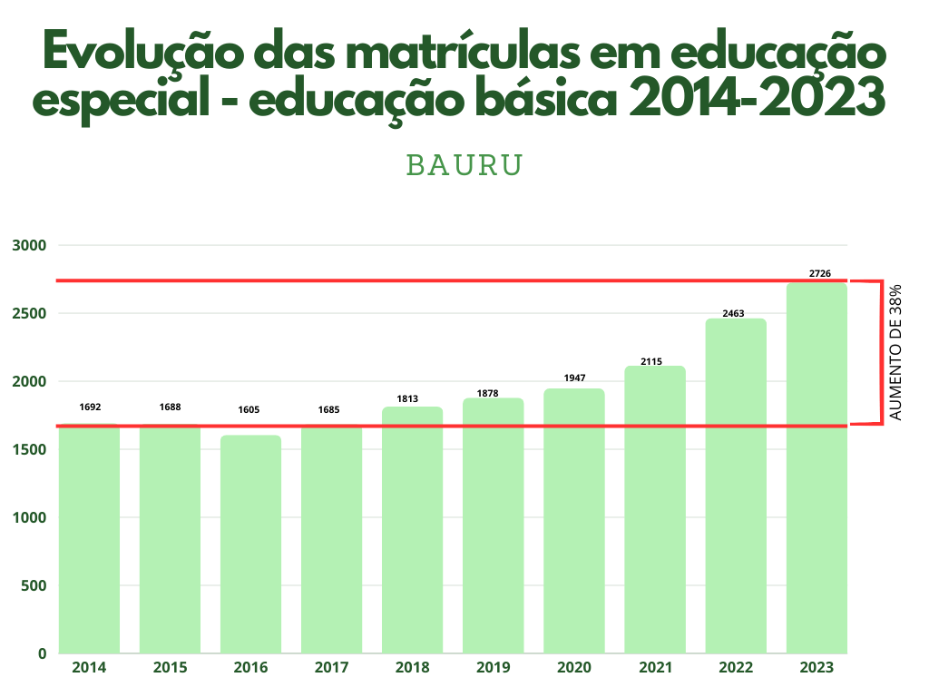 Segundo o Censo Escolar de 2023, divulgado em fevereiro deste ano, o número de matrículas na educação básica especial na cidade Bauru/SP representa 3,33% (2.726 matrículas) do total de matrículas da rede básica de ensino (81.810 matrículas) no ano de 2023.