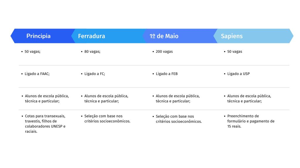 Organizados e administrados pelos próprios alunos, os cursinhos populares pré-vestibular, oferecidos pela USP (Universidade de São Paulo) e Unesp (Universidade Estadual Paulista) têm o intuito de preparar jovens de baixa renda para encarar as principais provas do país que dão acesso ao ensino superior.