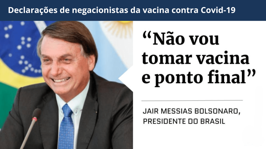 No que diz respeito ao negacionismo, o próprio ex-presidente Jair Bolsonaro foi uma peça chave para a propagação de informações falsas e fortalecimento do discurso negacionista, onde o ex-chefe do executivo desmereceu recomendações dadas pela Oms e advogou a favor de remédios milagrosos que na verdade não tinham eficácia comprovada contra a Covid-19.