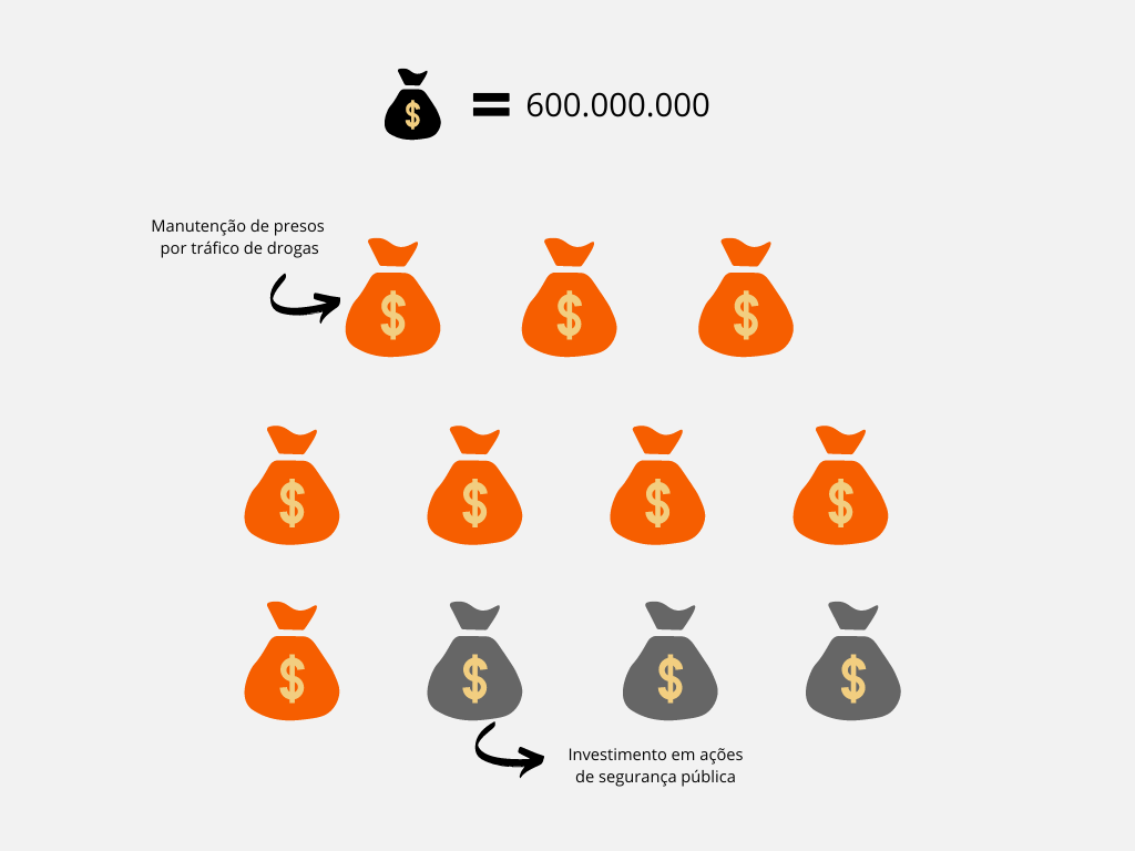 Dados da SISDEPEN apontam que a manutenção dos presos por tráfico de drogas custou 4,8 bilhões de reais aos cofres federais e estaduais no ano de 2022. Enquanto isso, o Fundo Nacional de Segurança Pública teve orçamento de 1,8 bilhão de reais. A proporção pode ser conferida na ilustração abaixo: