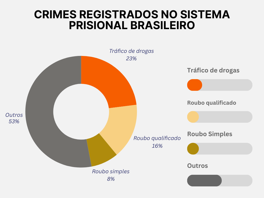 No segundo semestre de 2022, o tráfico de drogas foi o crime com maior número de registros no sistema prisional brasileiro, segundo dados da SISDEPEN. Das 734 mil ocorrências de crimes registrados, 169 mil (23%) correspondiam a tráfico de drogas, como pode ser verificado no gráfico abaixo: