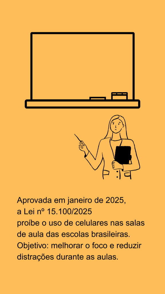 Em 2025, desde o início do ano letivo, os celulares estão proibidos nas salas de aula de escolas brasileiras. Sancionada em janeiro, a nova lei federal (Lei nº 15.100/2025) estabelece que os dispositivos só podem ser utilizados em contextos pedagógicos, intervalos ou emergências. A medida chega após anos de debates sobre o impacto dos celulares na aprendizagem e, ao mesmo tempo em que se consolidaram como ferramentas de acesso ao conhecimento, os dispositivos também se tornaram fontes constantes de distração, dificultando a concentração em sala e comprometendo a relação entre alunos e professores. O novo regulamento tenta reverter esse cenário, impondo uma barreira entre o uso para fins de aprendizagem e o uso pessoal.