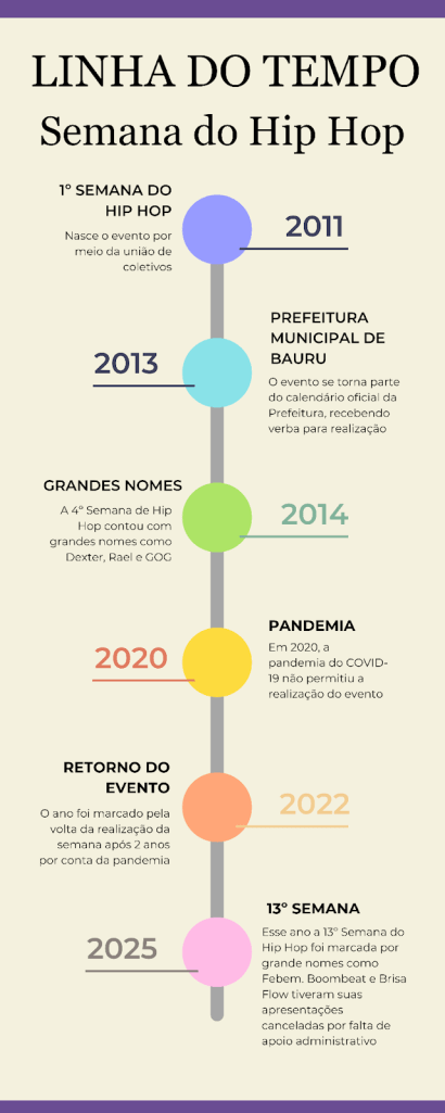 Durante os dias 07 e 16 de novembro de 2025, ocorreu a 13º Semana do Hip Hop em Bauru. Mesmo trazendo consigo uma forma de lembrança, luta e resistência contra o racismo estrutural e o apagamento da cultura negra na cidade, os produtores encontraram diversos obstáculos para a realização do evento.