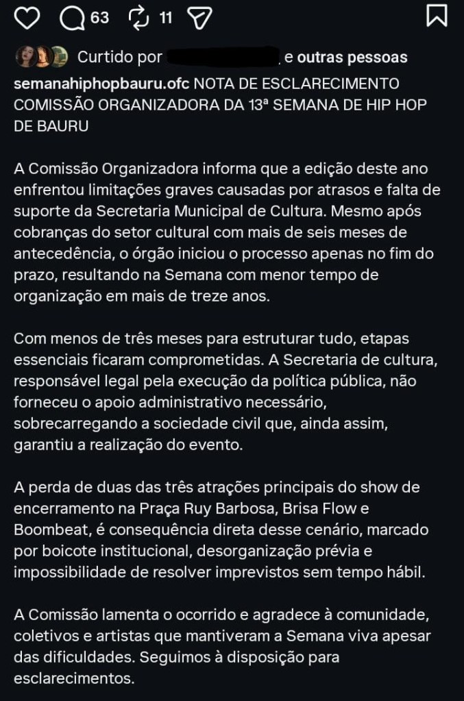 Em um comunicado oficial feito pelo perfil da Semana de Hip Hop no instagram (@semanahiphopbauru.ofc), a comissão organizadora explica que o cancelamento tanto do show da Boombeat, quanto do da cantora Brisa Flow, se deu por conta de atrasos e falta de suporte por parte da Secretaria Municipal de Cultura.