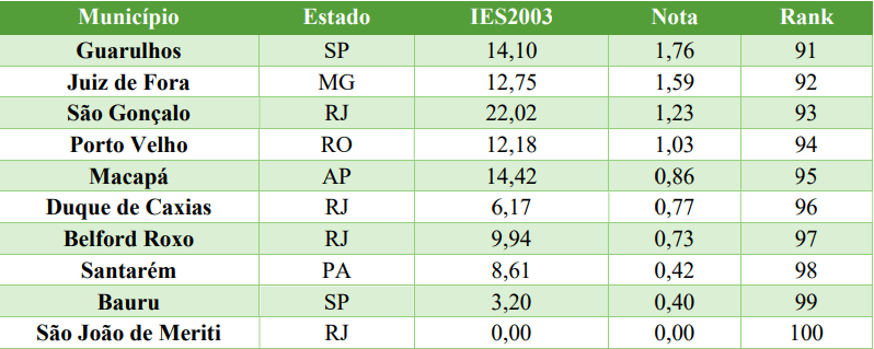Quadro: Piores Municípios – Indicador de Tratamento de Esgoto