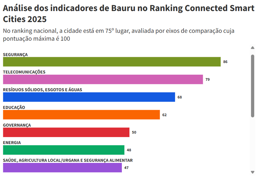 Em ambito nacional, Bauru ocupa a 75º posição, alcançando maiores pontuações em Segurança e Telecomunicações, e tendo uma pior classificação com Meio Ambiente, Mudanças Climáticas e Populações, Condições Sociais.